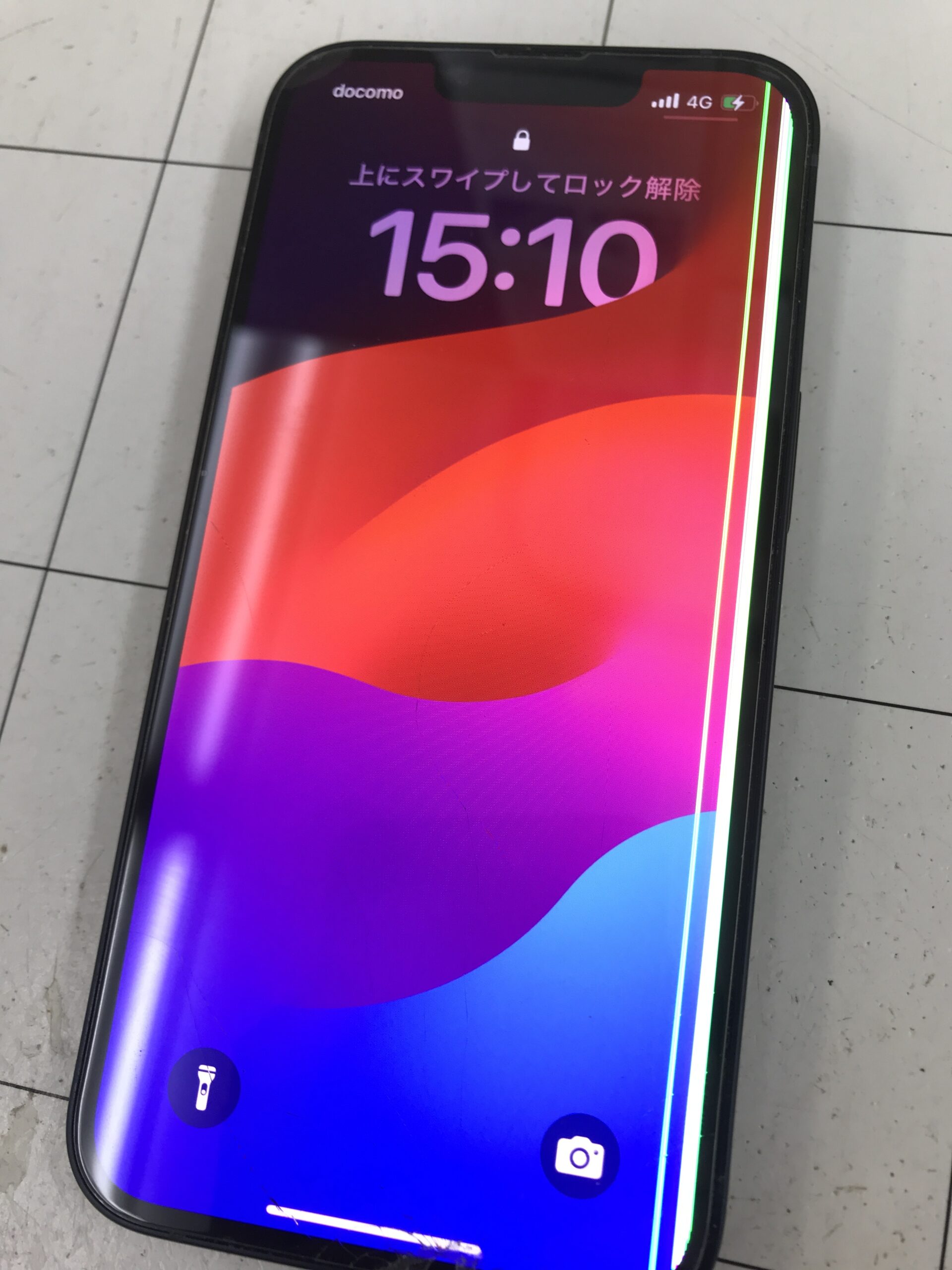 画面の下部分にガラス割れ、画面の右端には緑色の縦線が入ってしまっていますね・・・